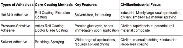 Pressure-sensitive adhesives are divided into three categories: solvent-based, water-based, and hot-melt, and the coating method needs to be adapted to the gel type, and the mainstream methods are as follows: